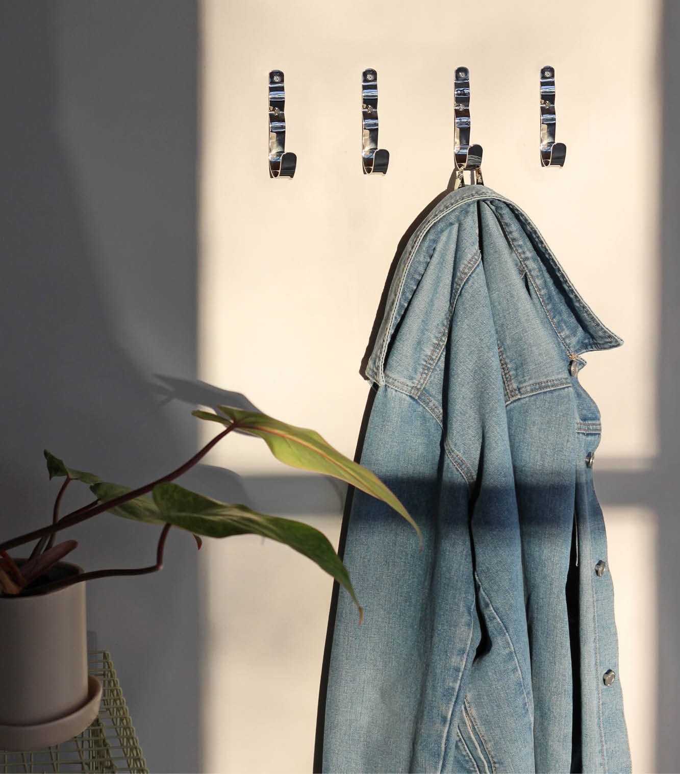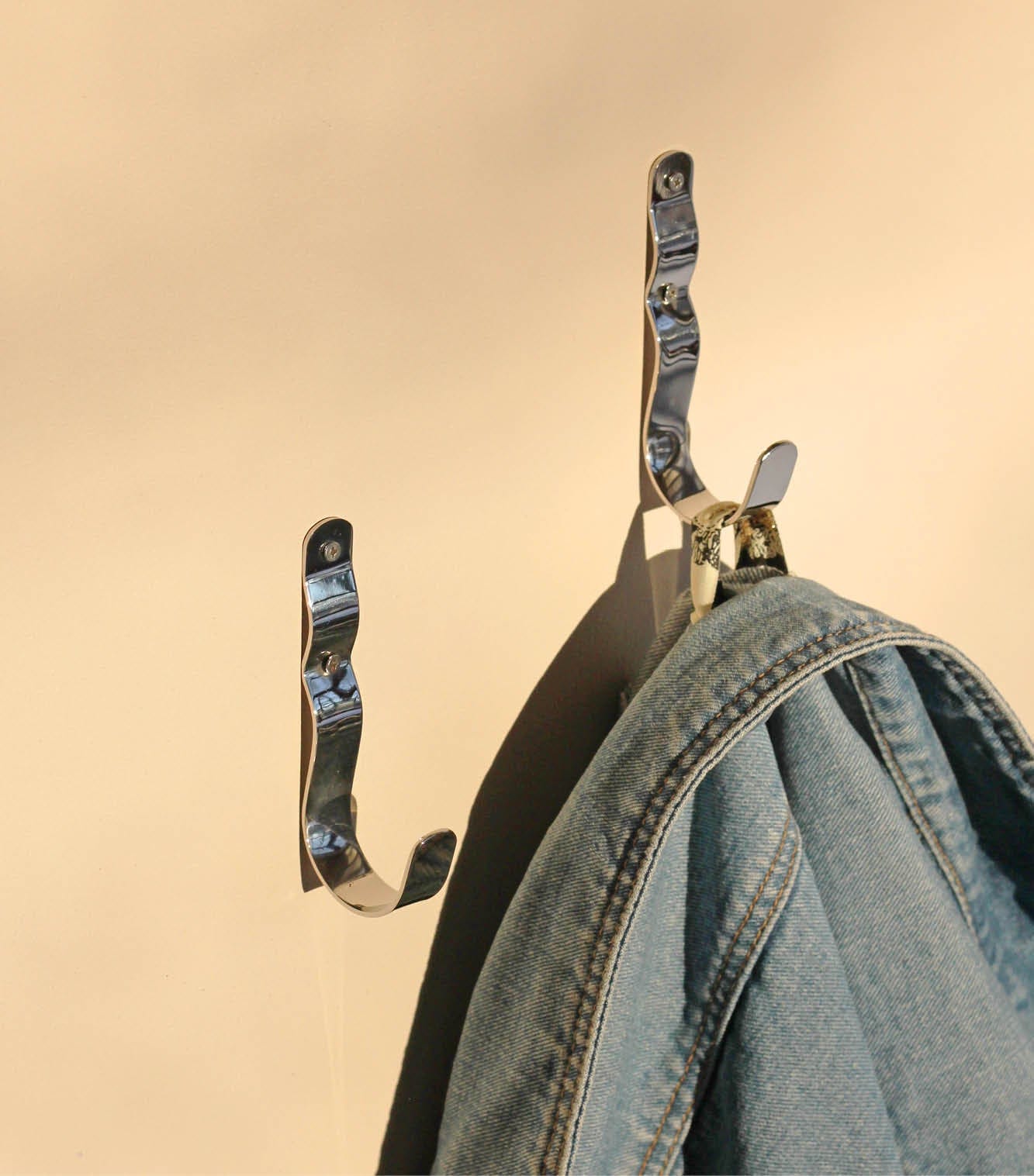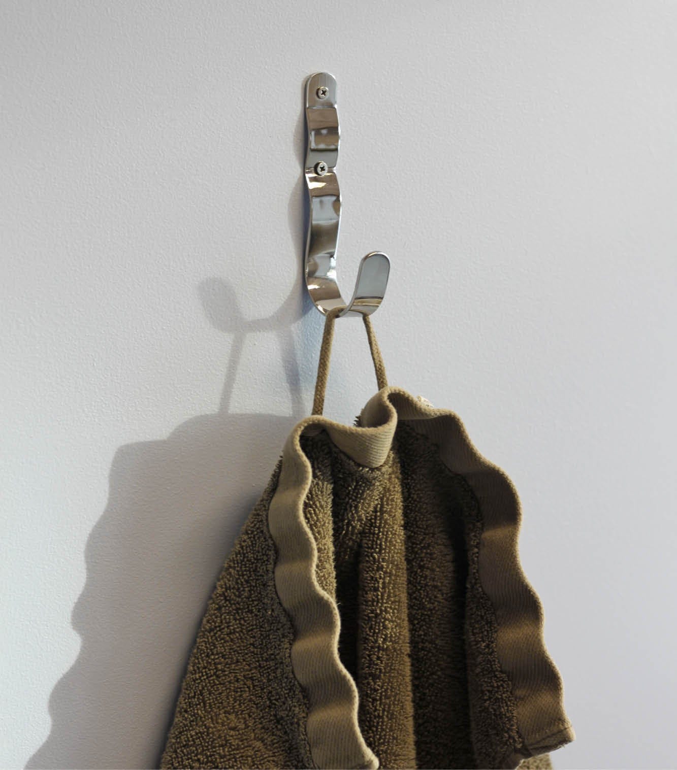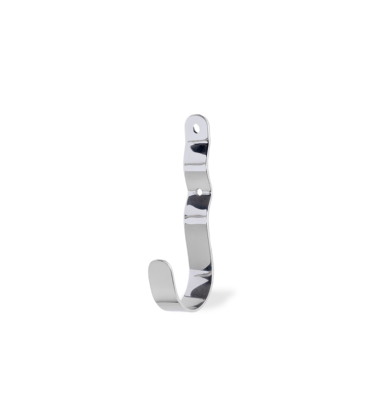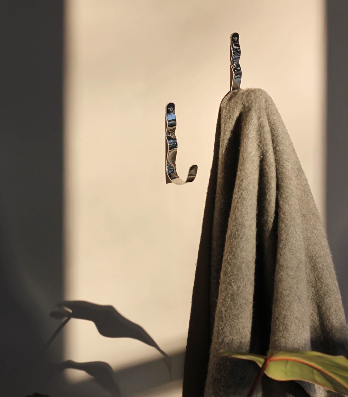 Wall-mounted hook in a timeless, glossy chrome look. Perfect for jackets in the entrance, towels in the bathroom, or dishcloths in the kitchen. The organic wave-like form softens the otherwise industrial steel look and adds an elegant touch.